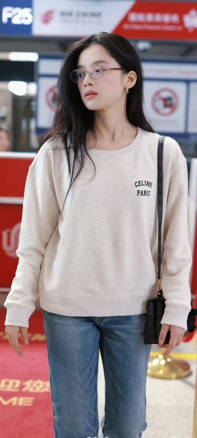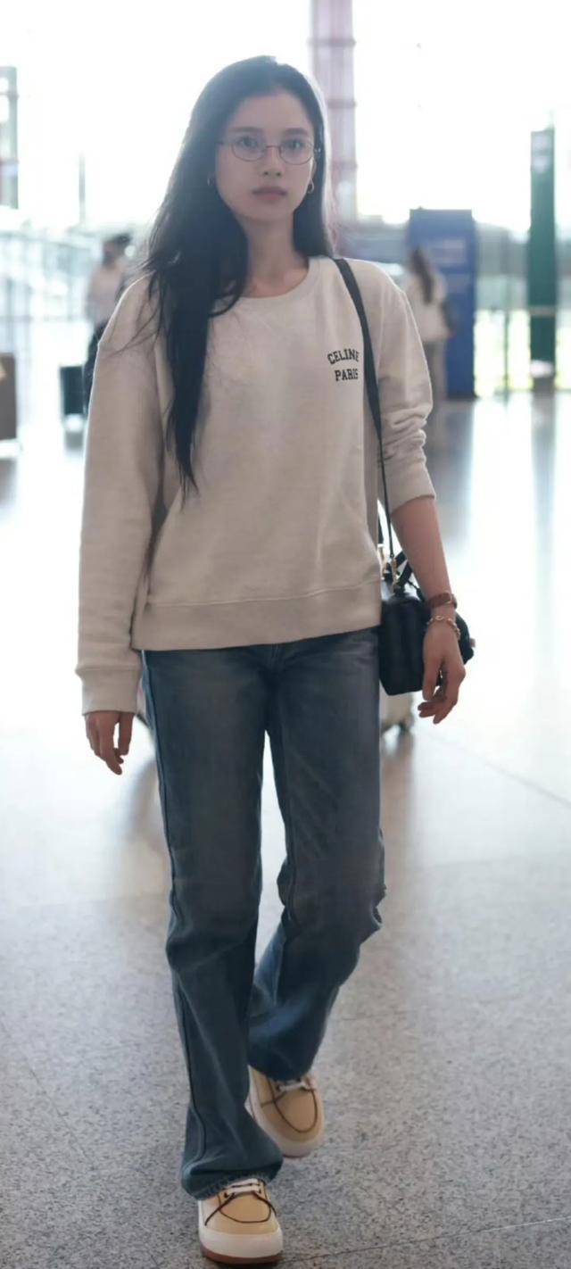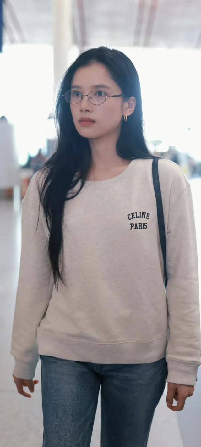 她身着长袖灰色卫衣款款而来,下半身是宽松的牛仔裤,一个黑色的单肩包。这样的穿着并不出众,反而有一种泯然众人的感觉。只是,尽管她如此的低调的穿着也无法掩盖她的美。